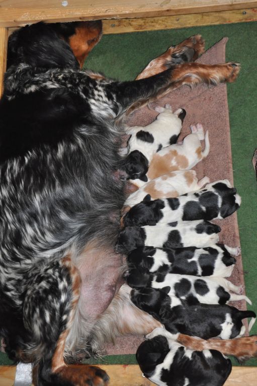 Unsere junge Tricolorhündin Lara vom Junkenhof umsorgt ihre am 7.4.2018 geborenen neun Bretonenwelpen sehr fürsorglich. Die Familie wächst und gedeiht! Eine schwarz weiße Hündin sucht noch eine Zuhause.